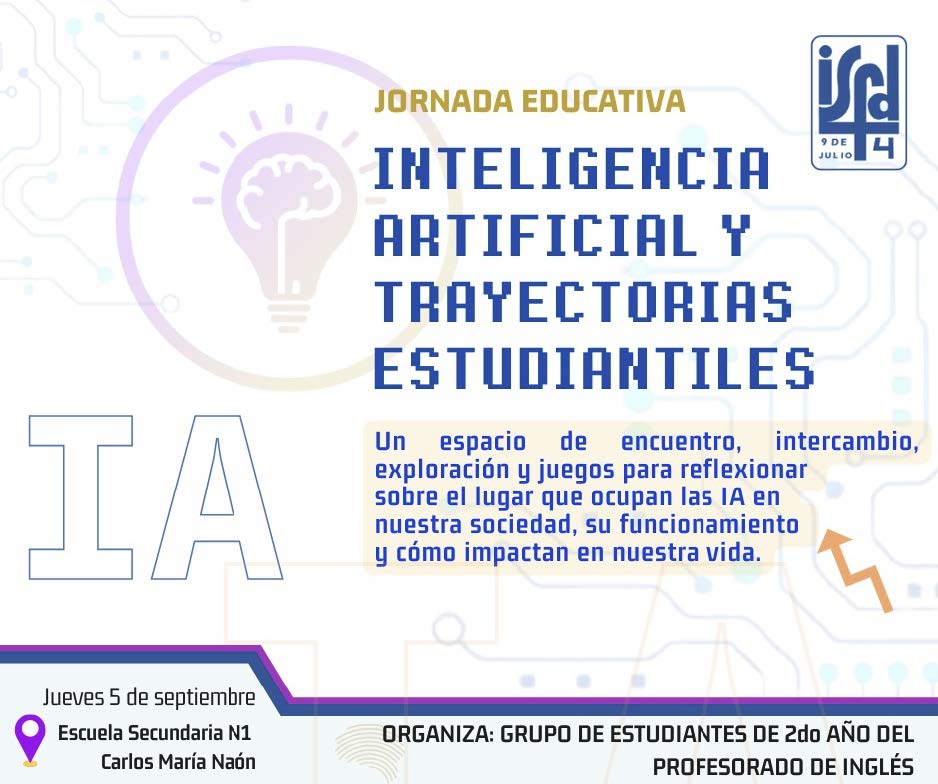 En el marco del proyecto “Inteligencia artificial (A.I.) y trayectorias estudiantiles” el grupo de estudiantes del ISFDyT4 visitó la Escuela de Educación Secundaria N1 (localidad de Carlos María Naón) con el fin de desarrollar y promover un espacio de encuentro, intercambio, exploración, juegos y exposición para reflexionar sobre el lugar que ocupan las IA en nuestras vidas cotidianas, su funcionamiento y cómo impactan en la vida de los estudiantes.